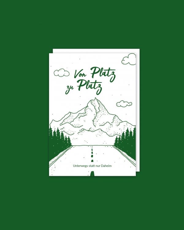 "Von Platz zu Platz - Unterwegs statt nur Daheim" lautet die Überschrift dieser fernwehweckenden Postkarte im DIN A 6 Format (10,5 cm x 14,8 cm) und lässt wohl das Herz eines jeden Campers Purzelbäume schlagen. Zusehen ist eine Straße und im Hintergrund die Berge. Wo führt dich die Reise diesmal hin?